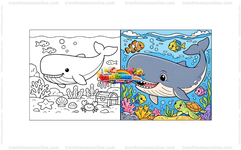 Mỗi hình tranh tô màu cá nhà táng dưới đây đều được thiết kế rõ ràng với các chi tiết như sóng biển, rạn san hô, đàn cá hoặc những sinh vật sống dưới đáy đại dương. Người xem chỉ cần nhấp vào bức tranh mình yêu thích, hệ thống trên website Tranh Tô Màu Online sẽ tự động mở giao diện tô màu trực tuyến để bắt đầu thực hiện ngay trên màn hình.