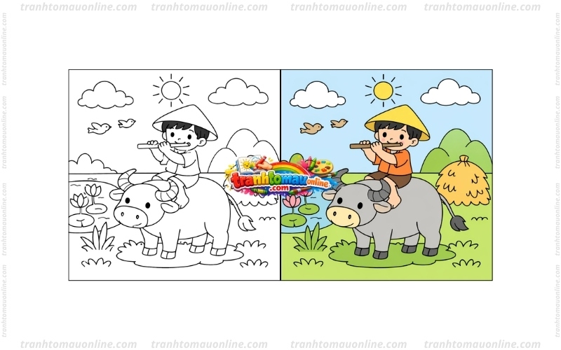 - Phát triển trí tưởng tượng: Bé có thể chọn màu sắc khác nhau cho đồng ruộng, bầu trời và chú trâu theo cách riêng của mình.