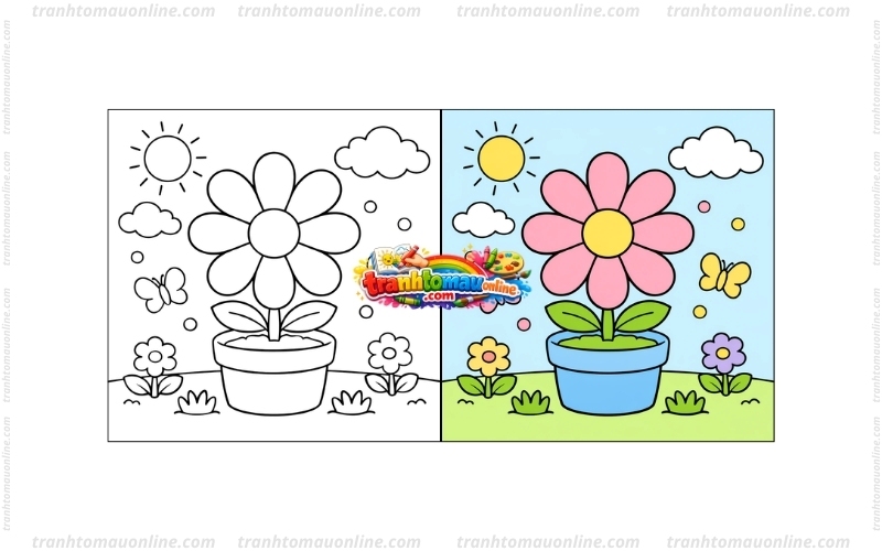 - Thêm màu cho nền xung quanh: Có thể tô bầu trời xanh, đồng cỏ xanh hoặc nền màu nhạt để bông hoa nổi bật hơn.