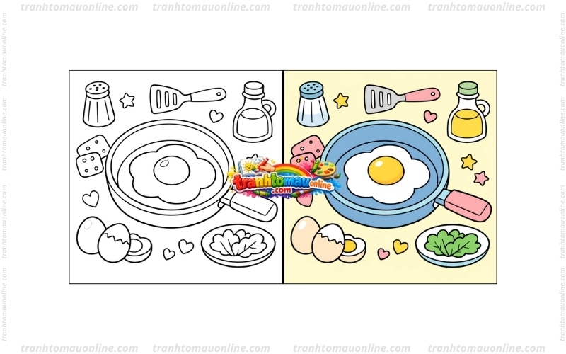 - Tô màu món ăn trong chảo: Trứng ốp la có thể tô lòng đỏ màu vàng, lòng trắng màu trắng; cá chiên có thể dùng màu vàng hoặc nâu nhạt.